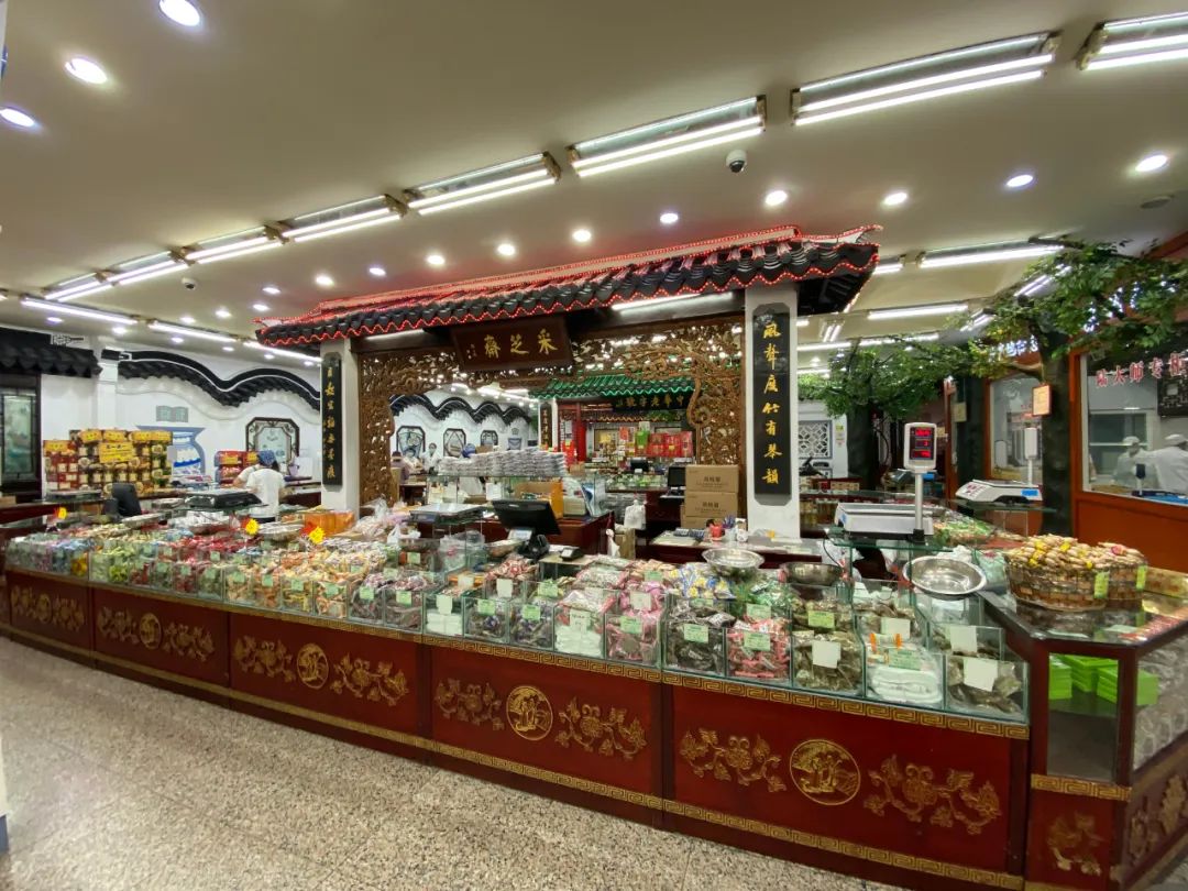 The entrance of CaizhiZhai shop looks like a small Suzhou garden. Exquisite window decorations, horizontal tablets and traditional couplets all around. On the wall opposite the gate there is a famous drawing of "collecting Zhi" : a fairy holding a walking stick, carrying the magic Zhi mushroom in a basket, and another immortal with a gourd bottle full of elixir on his shoulder. There are wall signs saying "unique candy" and "half-Chinese traditional medicine shop" hanging on the walls. The salespeople wear traditional clothes of Suzhou area. Pleasant-sounding Wu dialect and the graceful and moving Suzhou ballads blending into the shop atmosphere.