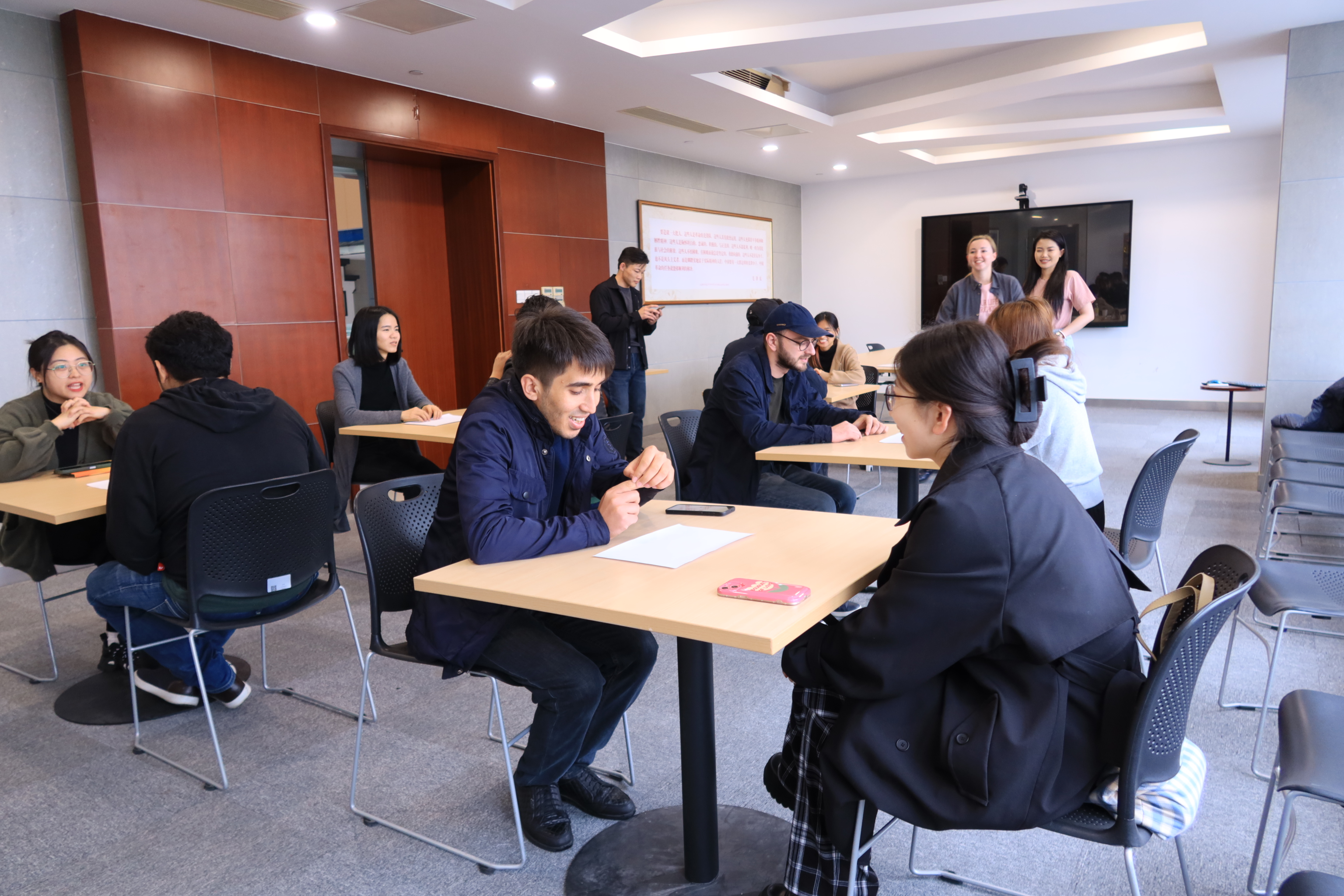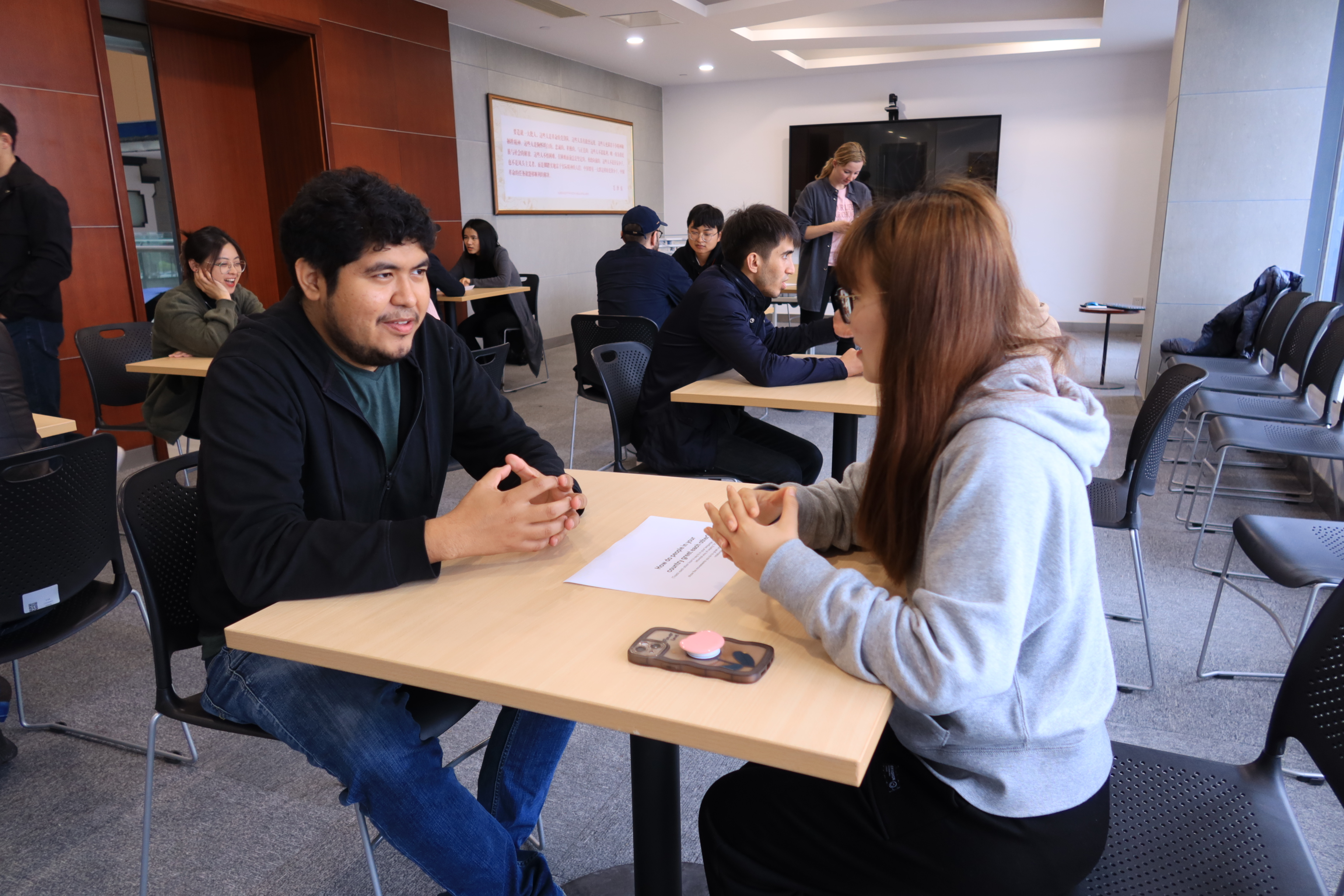 The event primarily took the form of one-on-one dialogues, where participants shared their perspectives from the standpoint of their respective countries on cultural taboos, greeting etiquette, the meaning of national flags, traditional festivals, wedding customs, cultural heritage, screen culture, social values, and other topics. They exchanged viewpoints and engaged in discussions. After one round of dialogues, they switched partners for a new round of exploration. The atmosphere was enthusiastic, with everyone passionately sharing their cultures and the continuous sparks of interaction. Both Chinese and foreign students were not willing to stop dialoguing even after several rounds of partner switches.