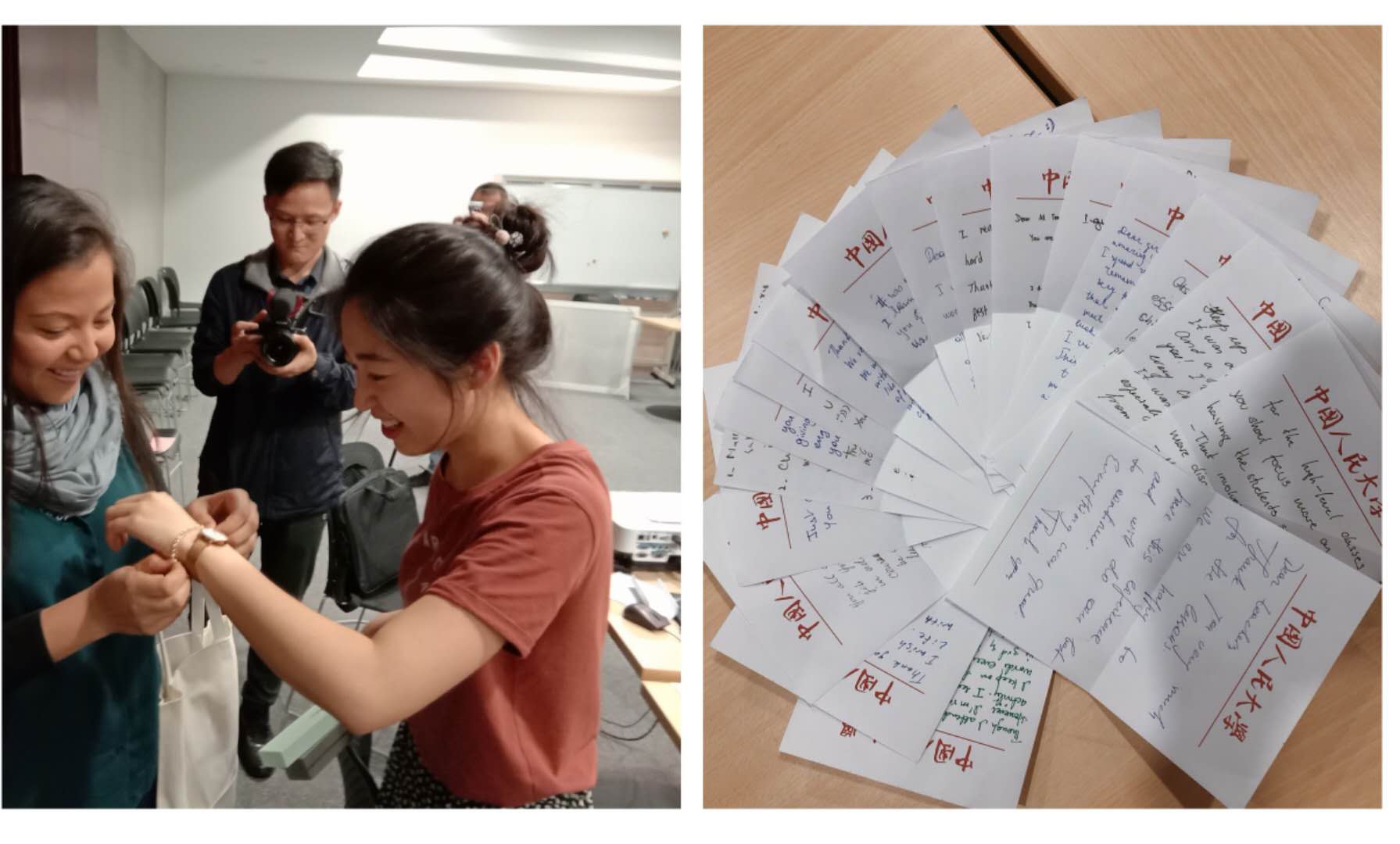 不知不觉,汉语角已经接近尾声,老师们为丝路学子送上了精心准备的剪纸作为礼物,留学生们也纷纷给老师留言送祝福,他们还特意为每位老师准备了精美的礼品,对老师们一年的辛勤付出表达感谢。在依依不舍的告别中,许多人闪着泪花,汉语这座桥梁将来自世界各地的学子紧密联系在一起。