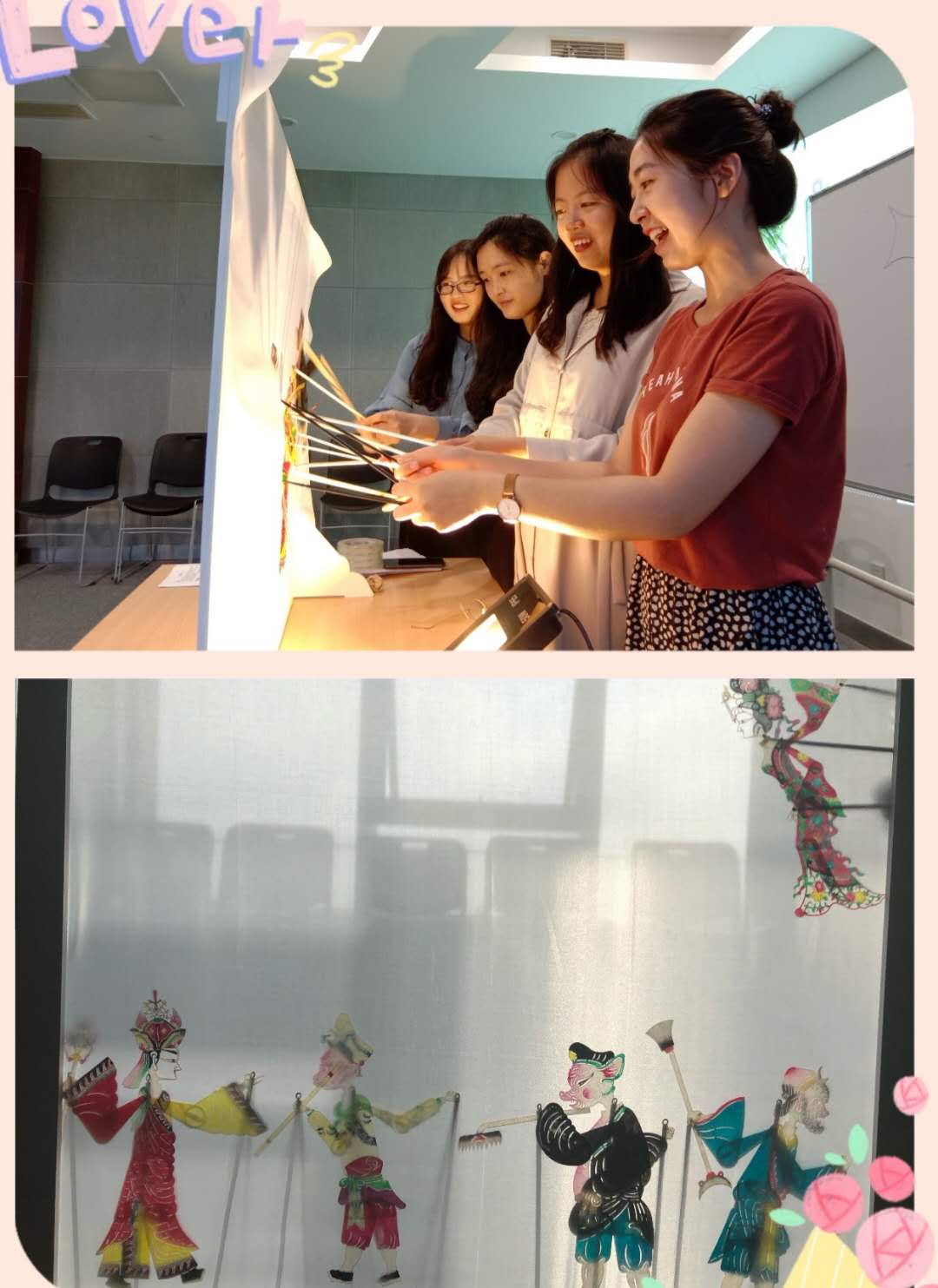 接着,老师们将我国非物质文化遗产皮影戏带进课堂。汉语角的老师们手持栩栩如生的人物皮影,亲自给每个角色配音,为学生们带来一段《三打白骨精》的皮影表演,留学生看得津津有味。大部分留学生是第一次看中国的皮影戏表演,他们忍不住赞叹中国古人的智慧,认为皮影戏是光影和戏曲艺术完美融合的表现。活动结束后,学生们自己走上台尝试皮影表演。虽然技艺有些生疏,但他们对皮影和中国传统文化的热情有增无减。