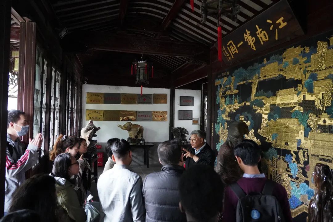 静思园,十年成园,将“师法自然和崇尚天人合一”的古典哲学与现代园林筑造技艺完美融合。在徐健先生的带领下,同学们畅游静思园,徜徉于亭台楼阁、水榭石舫间,欣赏数千枚奇峰异石,品味明、清、宋、元各个朝代的建筑之美。在游览过程中,徐健先生以各个景点为切入点,介绍了园林的建造艺术及其包含的思想内涵,如“左青龙,右白虎,上玄雀,下玄武”的居住“风水”;九曲桥包含的“移步换景、变换无穷”的韵味;飞檐如何体现“一飞冲天”的古代科举思想;末代状元陆润庠题额之砖雕门楼的盎然古趣;叠山理水阴阳平衡的深长意味等。徐先生用通俗易懂的语言、幽默有趣的小故事深刻揭示了中国古代文人内心宁静、享受当下、追求与自然和谐共存的处世哲学。